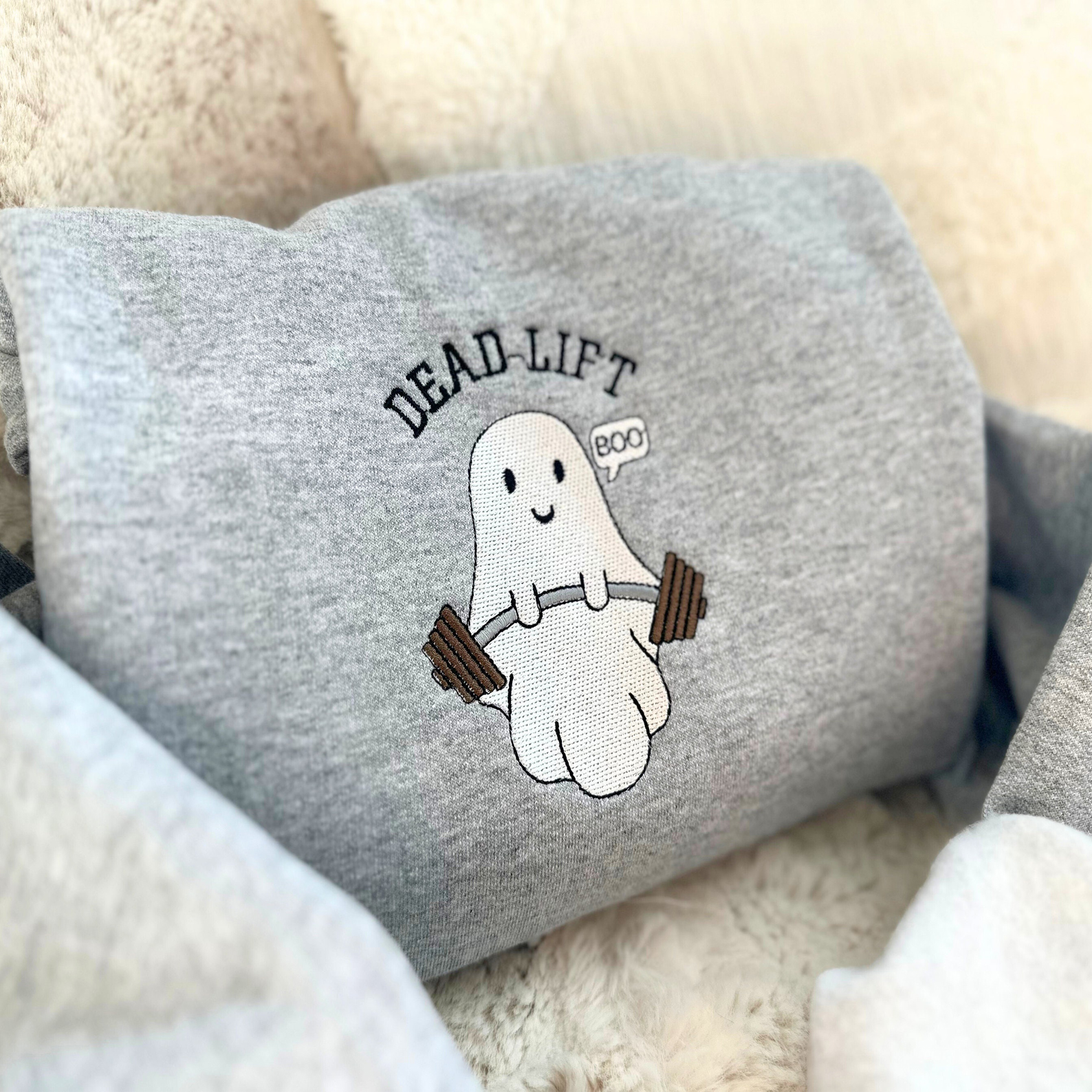 Unleash the spirit of fitness with our Deadlift Ghost Embroidered Sweatshirt! This unique piece combines spooky fun with serious style, perfect for gym enthusiasts and ghost lovers alike.