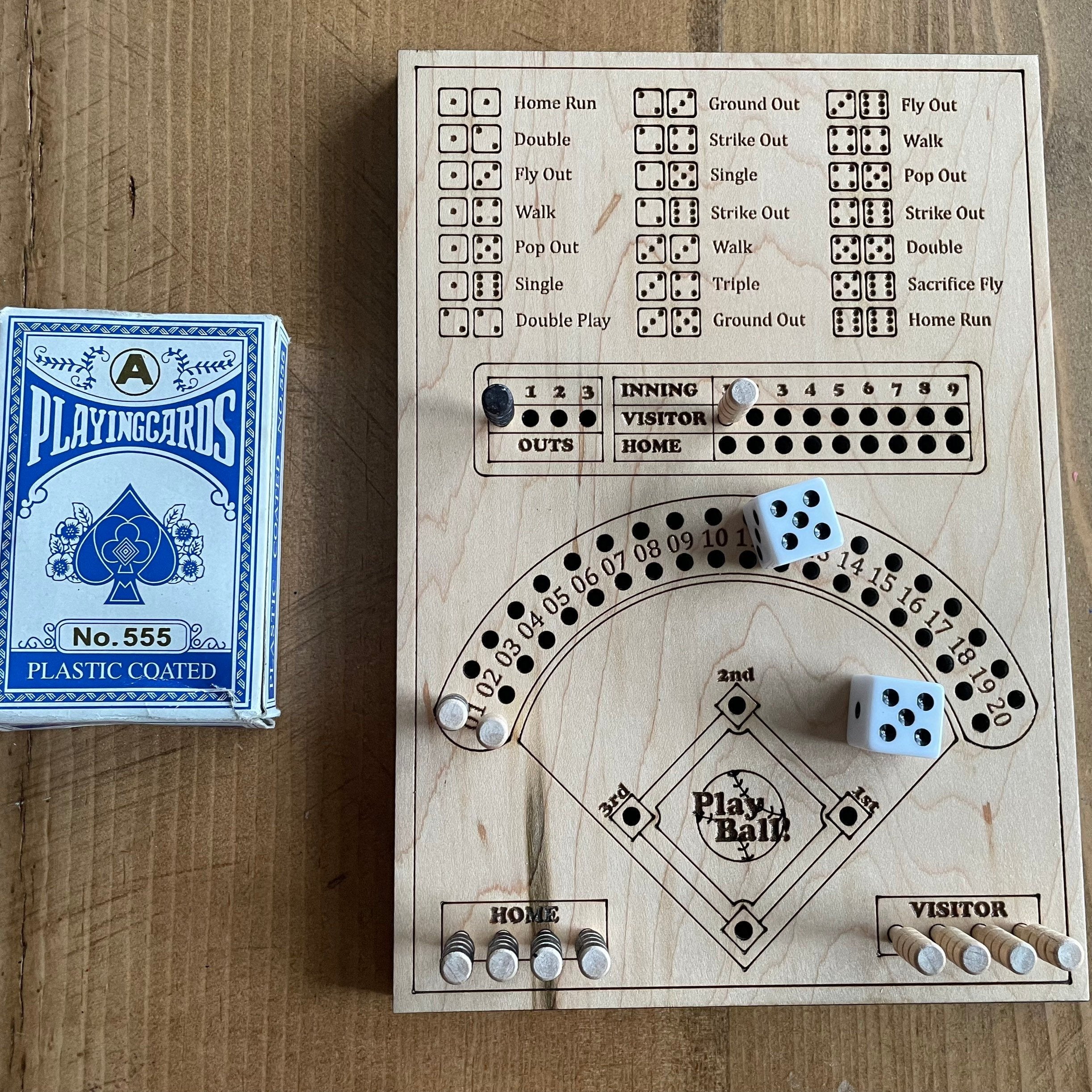 A 6"x8" sized version of dice baseball. Great for kids and travel. Comes with board, 12 cribbage pegs as markers, dice, and rules to play.