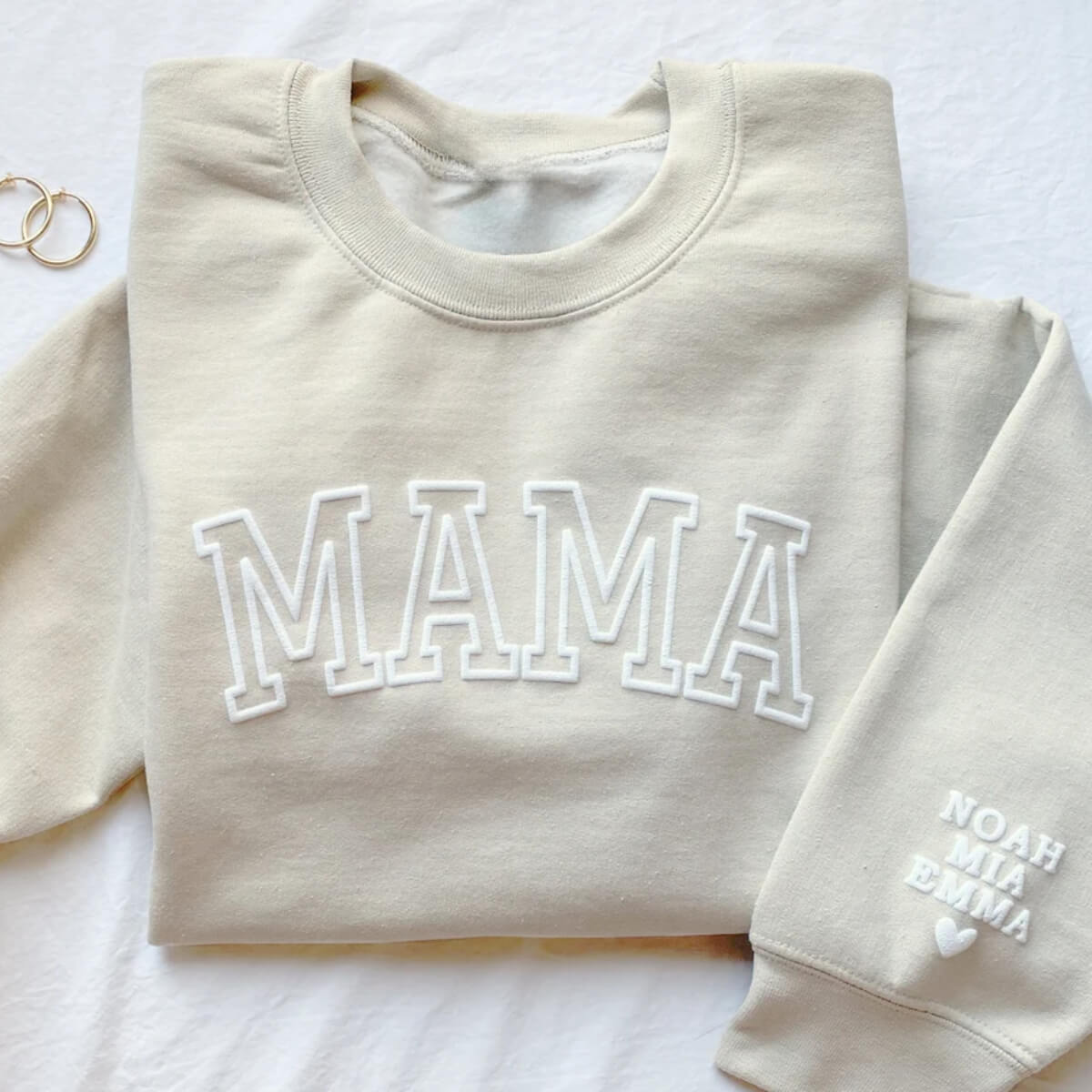 The Personalized Mama Sweatshirt with Kid Names on Sleeve is the perfect blend of comfort and love.